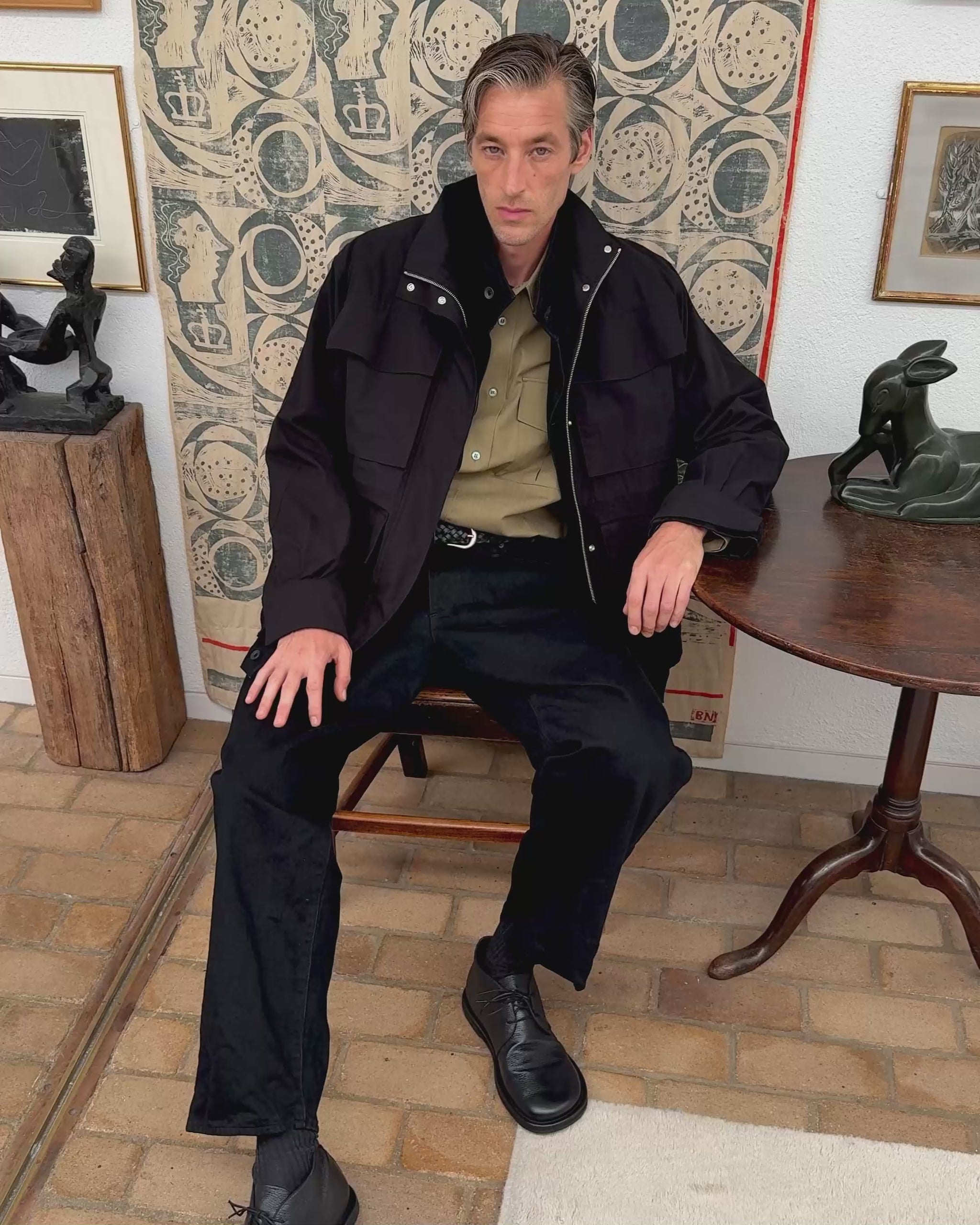 Studio Nicholson leans into classic field jacket silhouettes to create the Vista. It’s cut from our ‘typewriter’ cotton – a Japanese fabric chosen for its soft papery texture and the gentle rustling sound as it moves with the body. The jacket is crafted with dolman sleeves, four generous flap pockets and an elasticated drawcord waist that creates a relaxed, blouson fit.